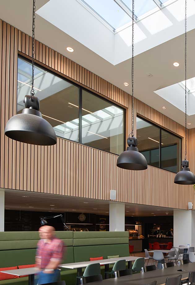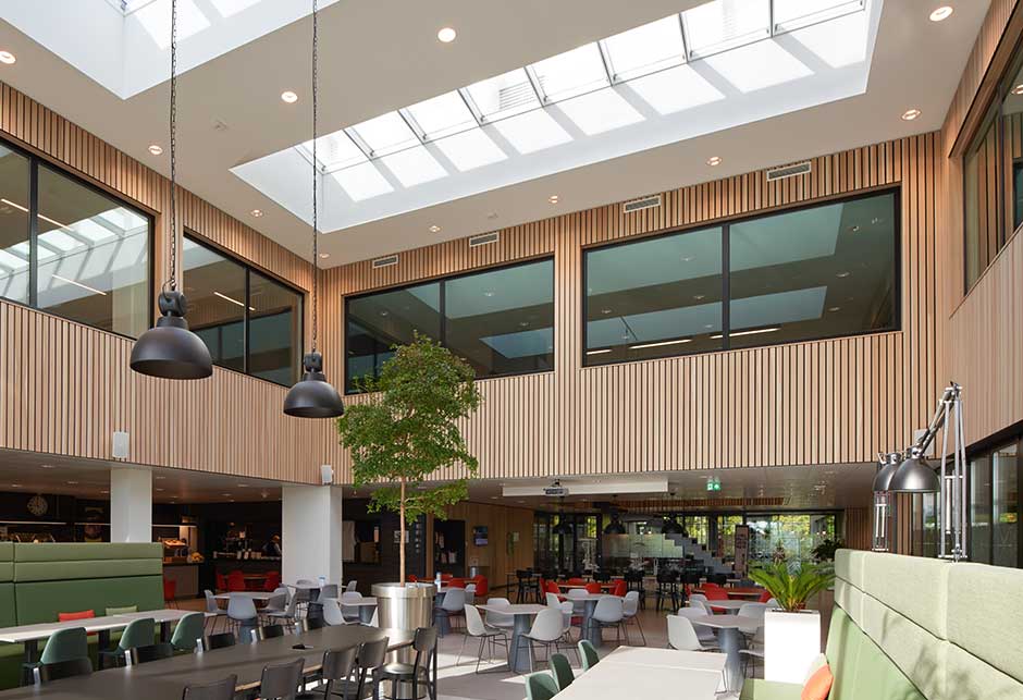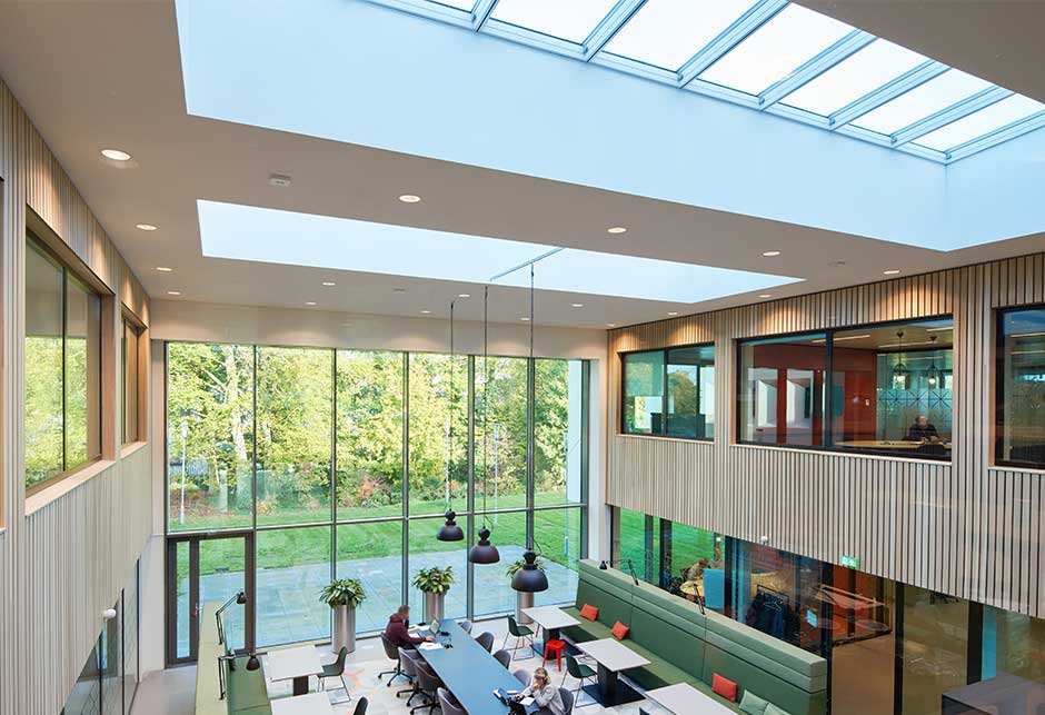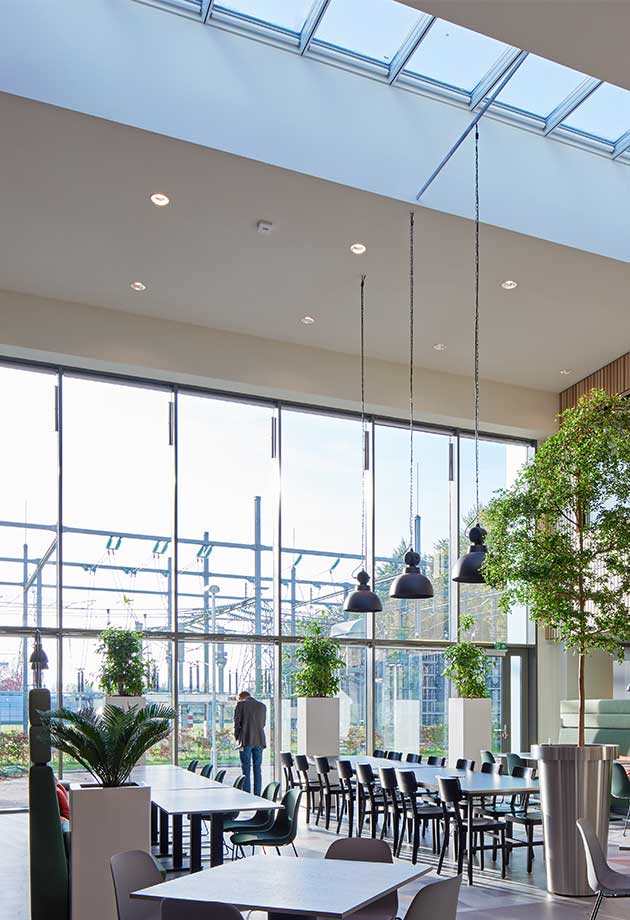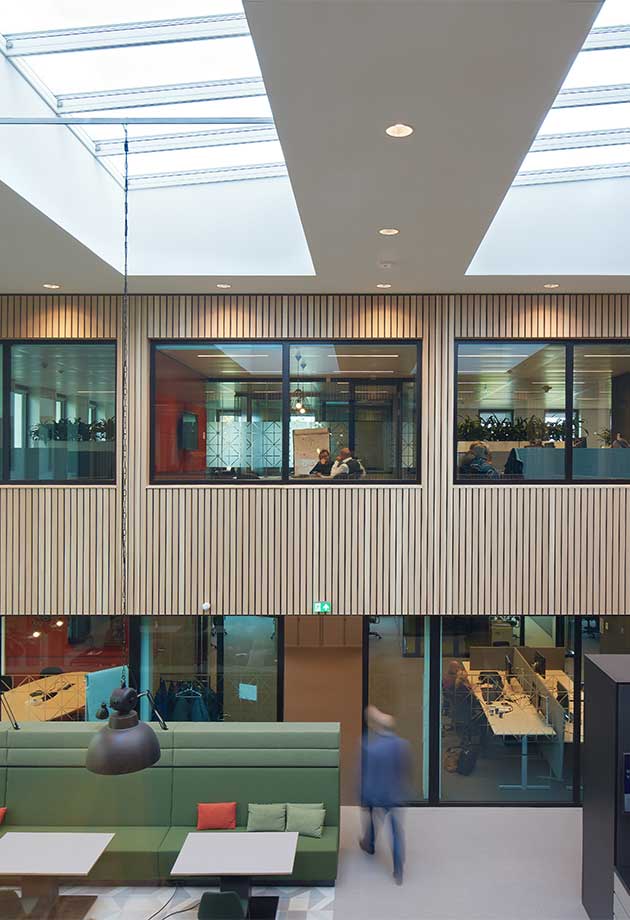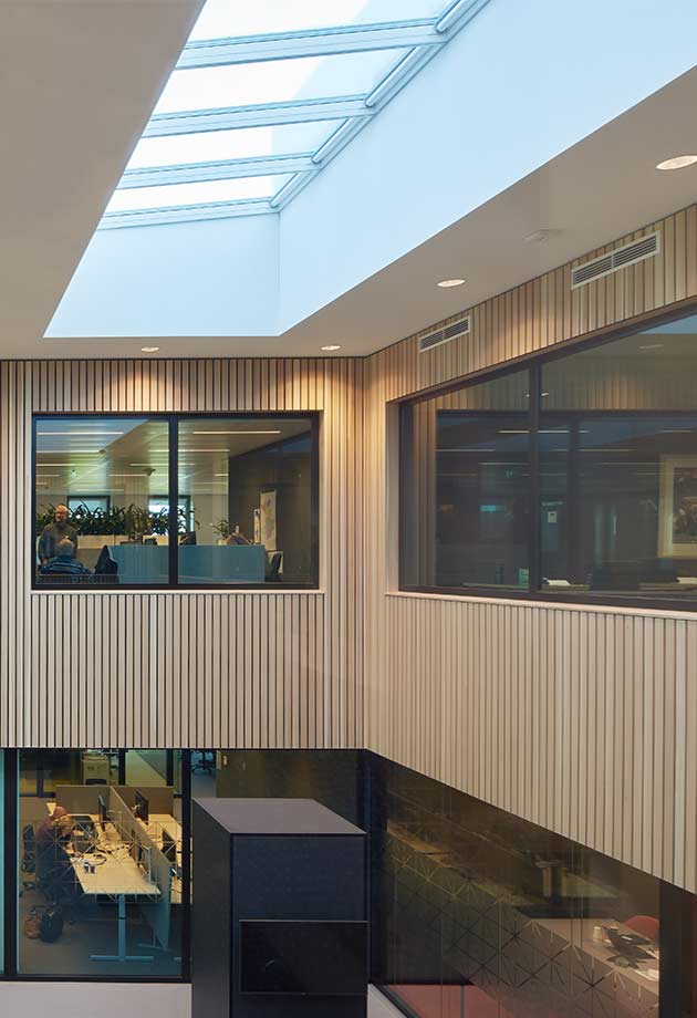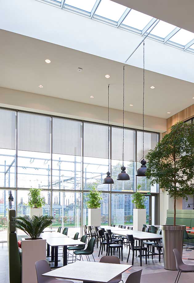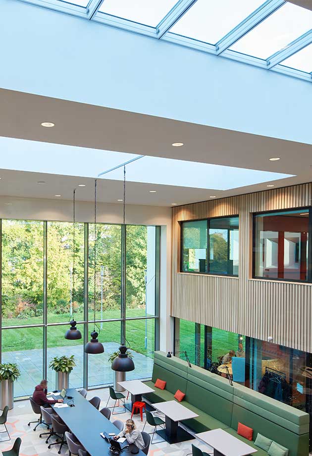 - Die Form und die Positionierung der Fenster begrenzen die direkte Sonneneinstrahlung im Sommer um die Mittagszeit und sorgen für ein angenehmes Tageslicht zum Arbeiten.