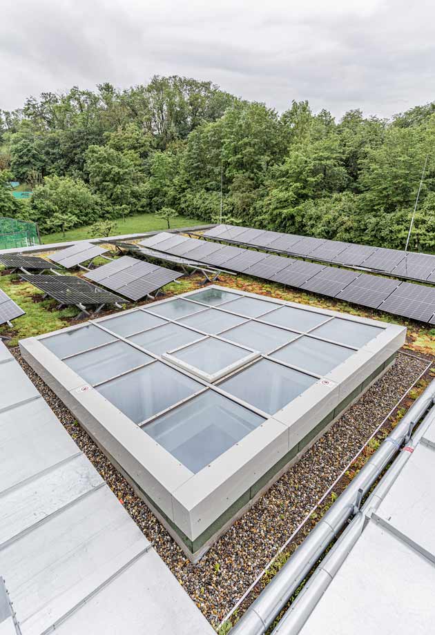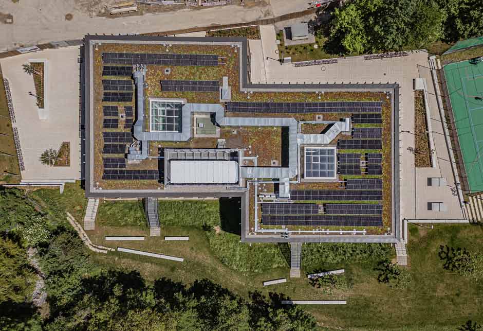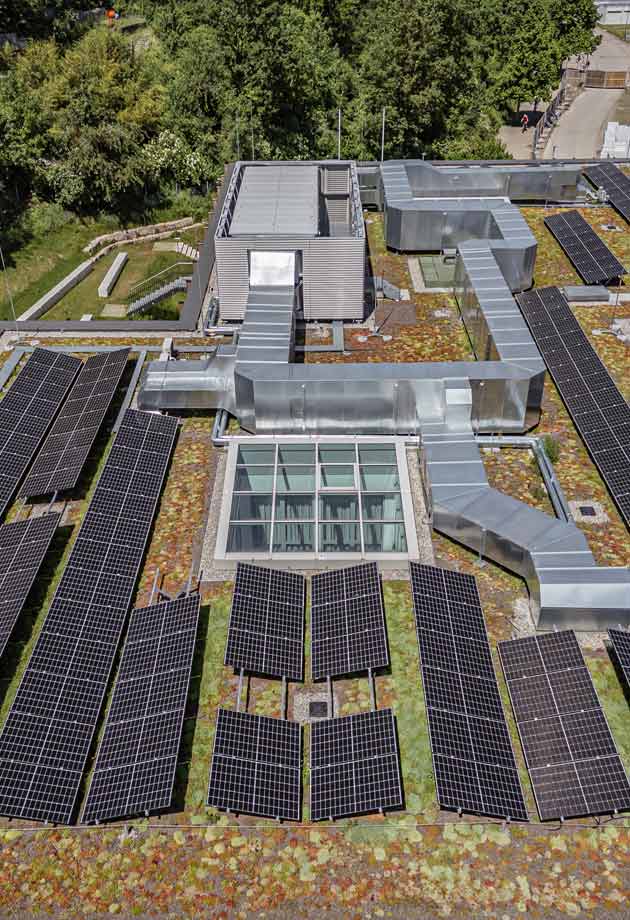 Weitere Maßnahmen, die dazu geführt haben, dass der Neubau den KfW-Energieeffizienz-Standard EG 40 erfüllt, waren die Begrünung der Dächer, die Installation eigener Photovoltaikanlagen zur Energiegewinnung sowie ein in den Atrien angebrachter Sonnenschutz.