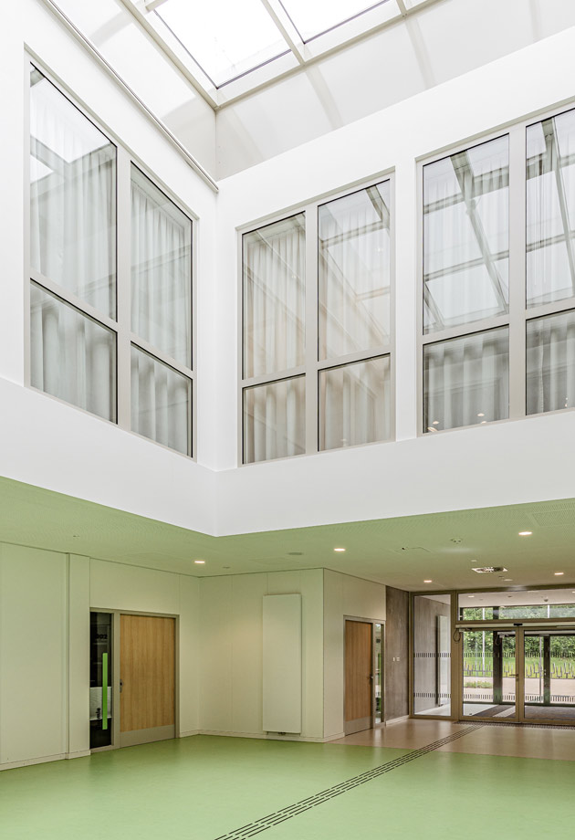 Beide Bauten, entworfen von den Architekten Auer Weber aus Stuttgart, setzen auf klar erkennbare Lernhäuser mit funktionalen Zentren. Die Klassen- und Inputräume sind um zwei Lichthöfe herum gruppiert, die selbst tief im Inneren des Gebäudes für großzügigen Tageslichteinfall sorgen. Ein wichtiger Aspekt beim Schulbau, denn wie das jüngst veröffentlichte Healthy Buildings Barometer noch einmal hervorhob, kann die Leistungsfähigkeit von Schülern durch mehr Tageslicht um bis zu 18 % steigen.