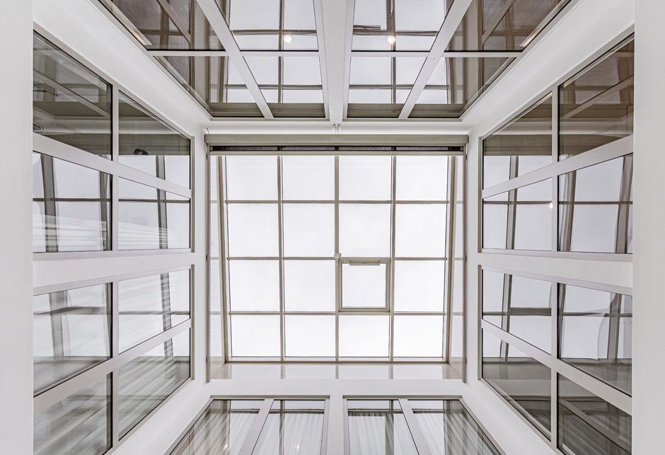 Um den Wünschen der Bauherren gerecht zu werden, musste die Verglasung der Lichthöfe diverse Anforderungen erfüllen. Die Wahl fiel dabei auf das selbsttragende BA-Pfosten-Riegel-System, das in der Glemstalschule aus jeweils 15 fest stehenden und einem öffenbaren Glaselement besteht. Dadurch wird neben einem großflächigen Tageslichteinfall auch ein bedarfsgerechter Luftaustausch ermöglicht.