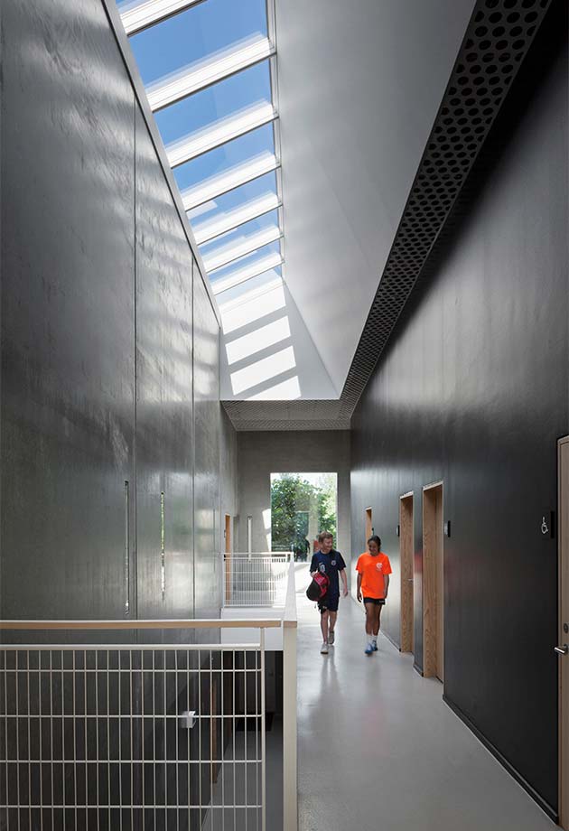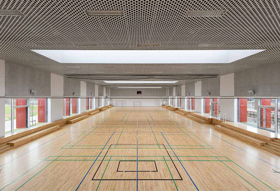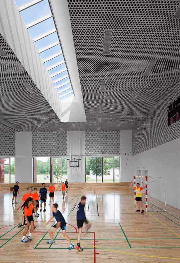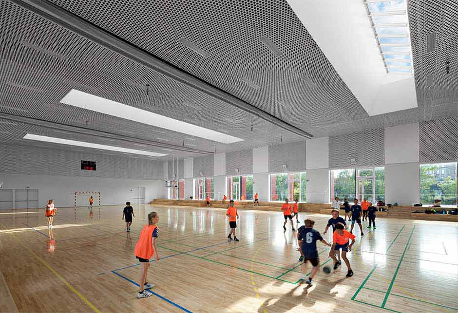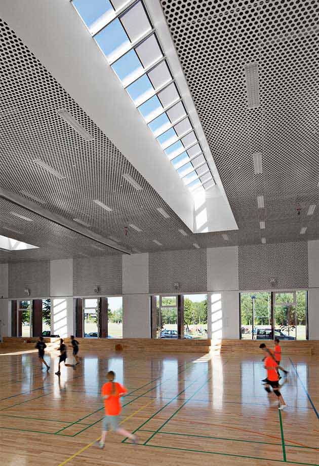 Dank einfallendem Tageslicht und der möglichen Komfortlüftung herrschen in der 2.500m² großen Sporthalle ideale Bedingungen für sportliche Events. Dies wird durch drei montierte Lichtbandreihen mit insgesamt 60 m² Glasfläche ermöglicht. Die nach Norden ausgerichteten Lichtbänder mit 20° Neigung sorgen dank der stark nach innen geneigten Innenlichte für viel natürliches Licht ohne direkte Blendwirkung. Durch diese Ausrichtung haben die Architekten des Büros CCO Architektur alle Anforderungen im Bezug auf Nutzung, Standort, Design und Energie erfüllen können.