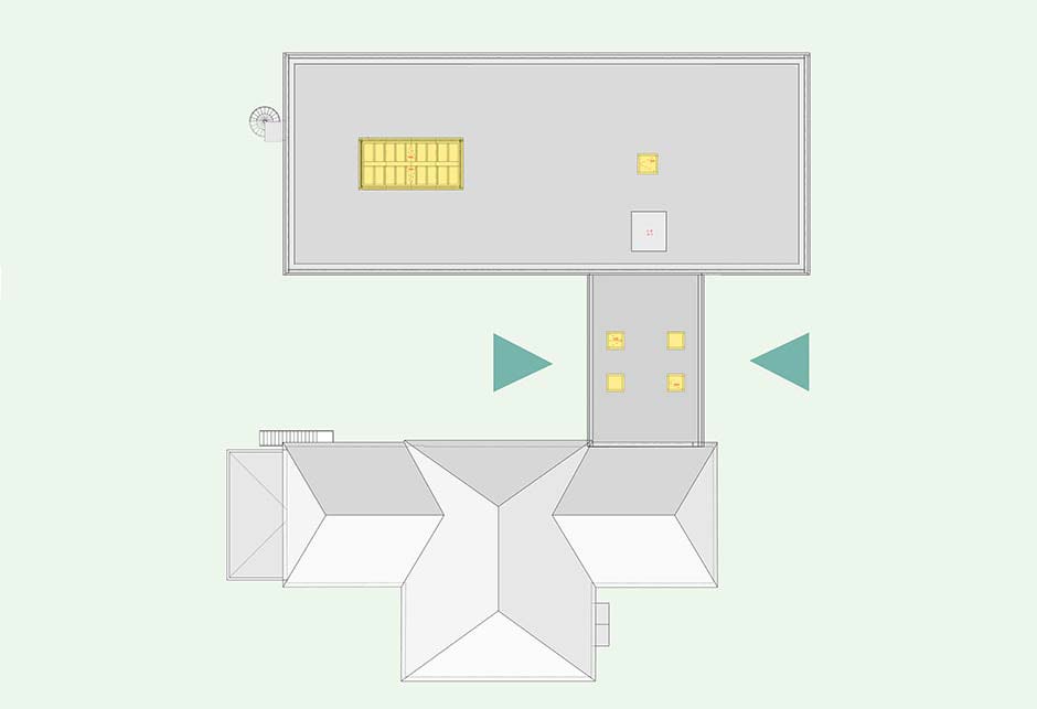 - Ein Sattel-Lichtband, das als eigenständiges Element auf das Flachdach aufgesetzt ist, versorgt diese Zone mit natürlichem Tageslicht und dient der Be- und Entlüftung.