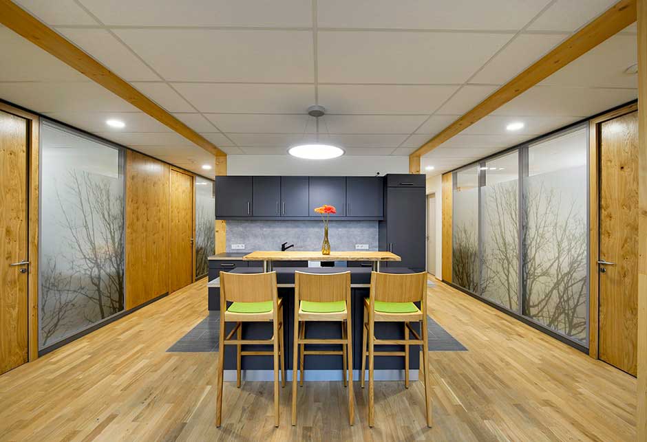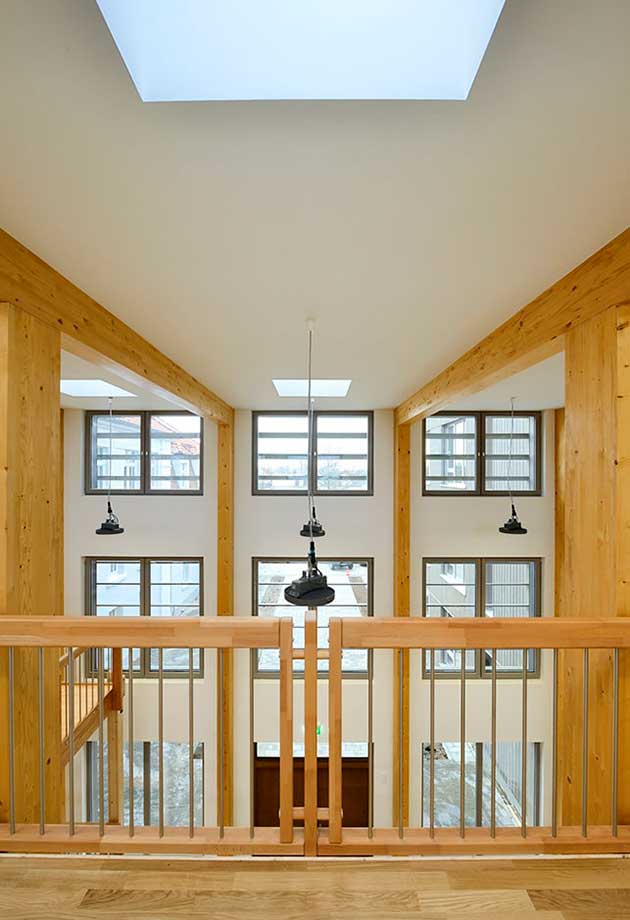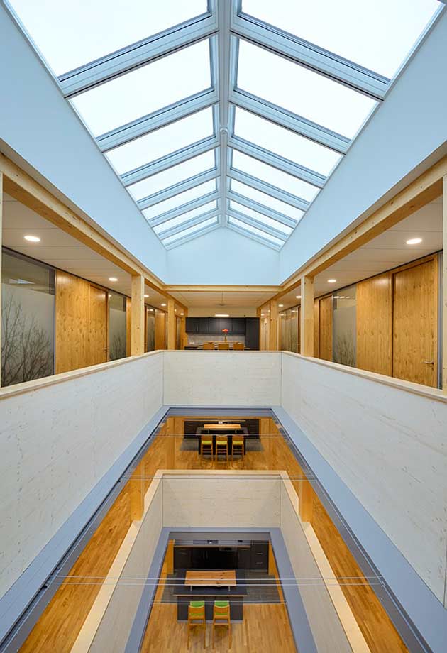 Die Mitte des dreigeschossigen Bürogebäudes bildet eine Multizone, die über alle Geschosse räumlich verbunden ist und mit VELUX Modular Skylights belichtet wird.
