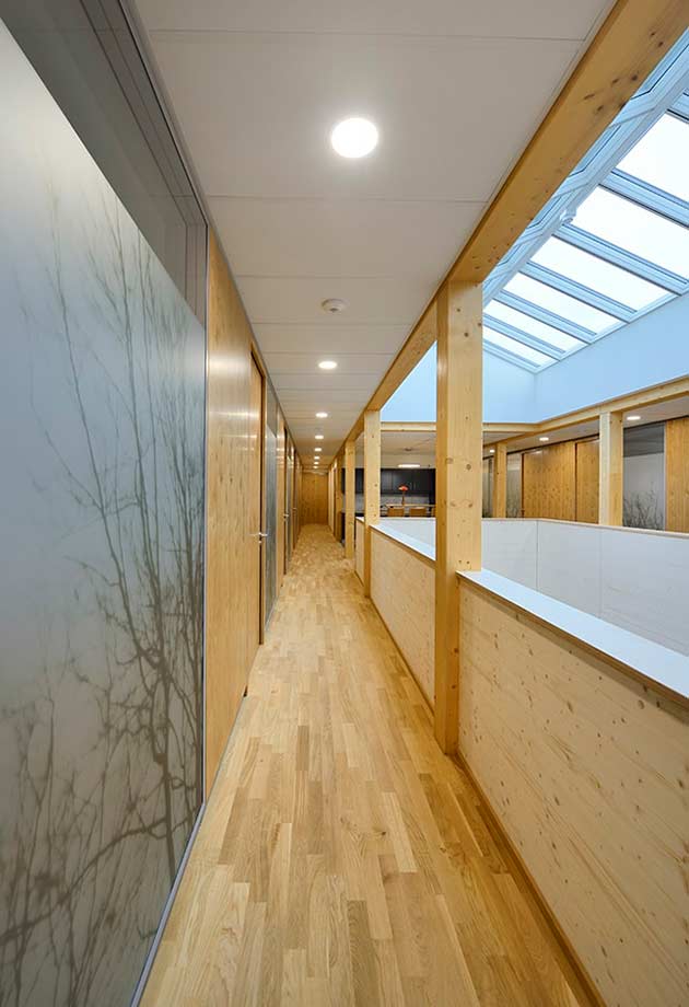 Rooflight solution with Ridgelight 25-40˚ modules, Von der Konstruktion über die Fassade bis zum Innenausbau demonstriert der Anbau des Verwaltungsbaus, was Holz aus einheimischen Wäldern in modernen Gebäuden zu leisten vermag.
